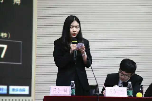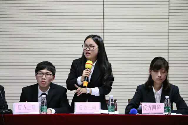 在辩论赛的最后环节,双方四辩做了己方观点的最后陈述,我方四辩蔡雪涵同学总结队员观点,并指出对方辩手在辩论环节中一些论证和数据的问题。