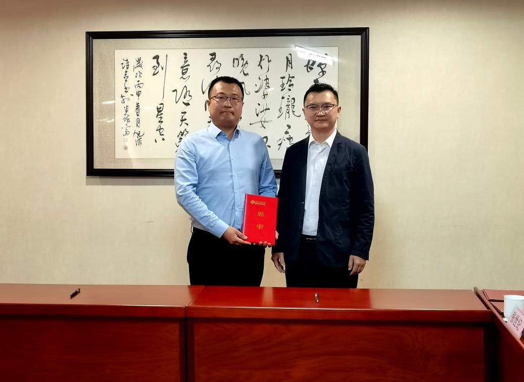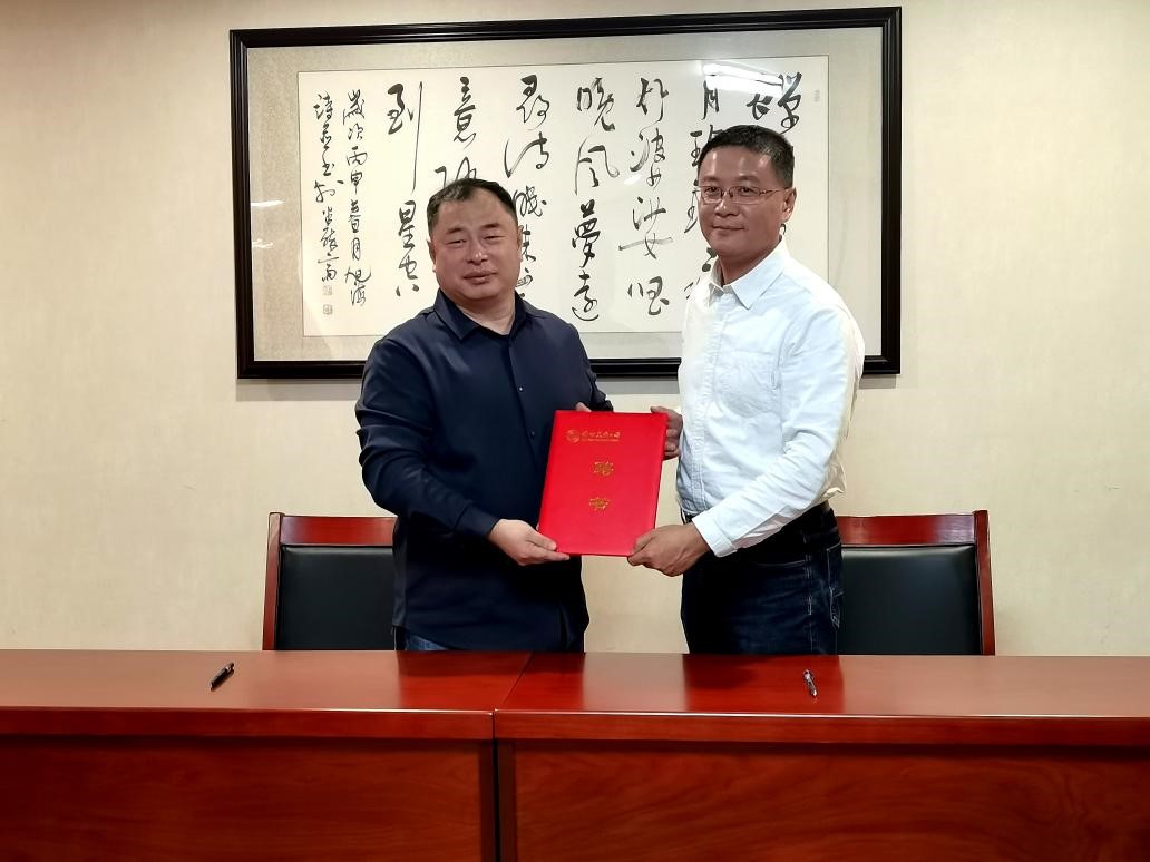 卢勇院长为朱新徽董事长颁发兼职教授聘书。