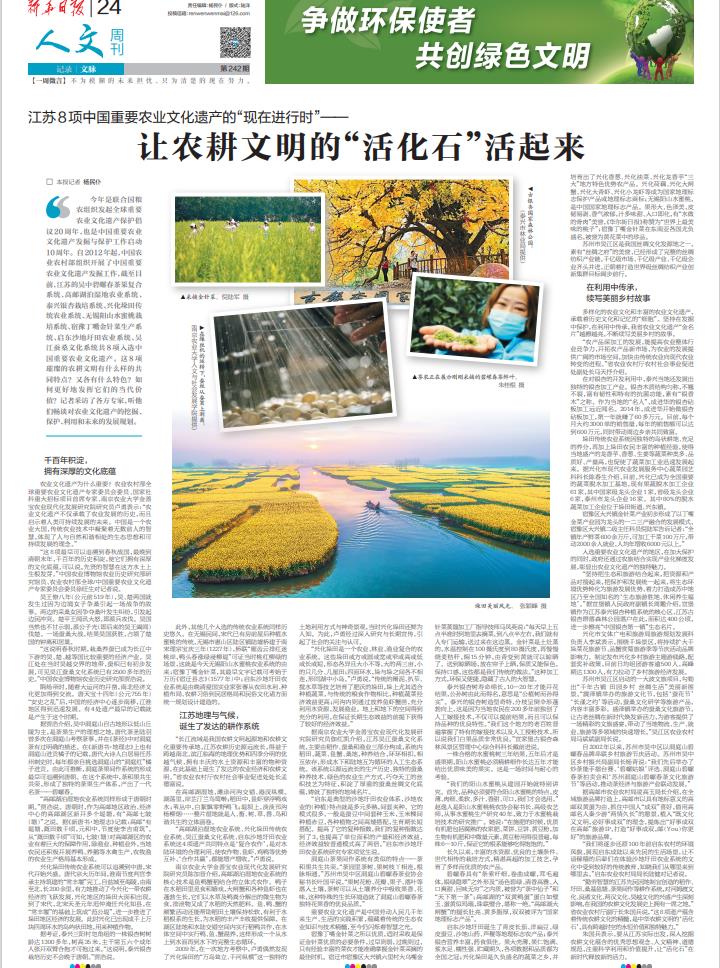 今年是联合国粮农组织发起全球重要农业文化遗产保护倡议20周年,也是中国重要农业文化遗产发掘与保护工作启动10周年。自2012年起,中国农业农村部组织开展了中国重要农业文化遗产发掘工作。截至目前,江苏的吴中碧螺春茶果复合系统、高邮湖泊湿地农业系统、泰兴银杏栽培系统、兴化垛田传统农业系统、无锡阳山水蜜桃栽培系统、宿豫丁嘴金针菜生产系统、启东沙地圩田农业系统、吴江蚕桑文化系统共8项入选中国重要农业文化遗产。这8项璀璨农耕文明有什么样的共同特点?又各有什么特色?如何更好地发挥它们的价值?记者采访了各方专家,听他们畅谈对农业文化遗产的挖掘、保护、利用和未来的发展规划。