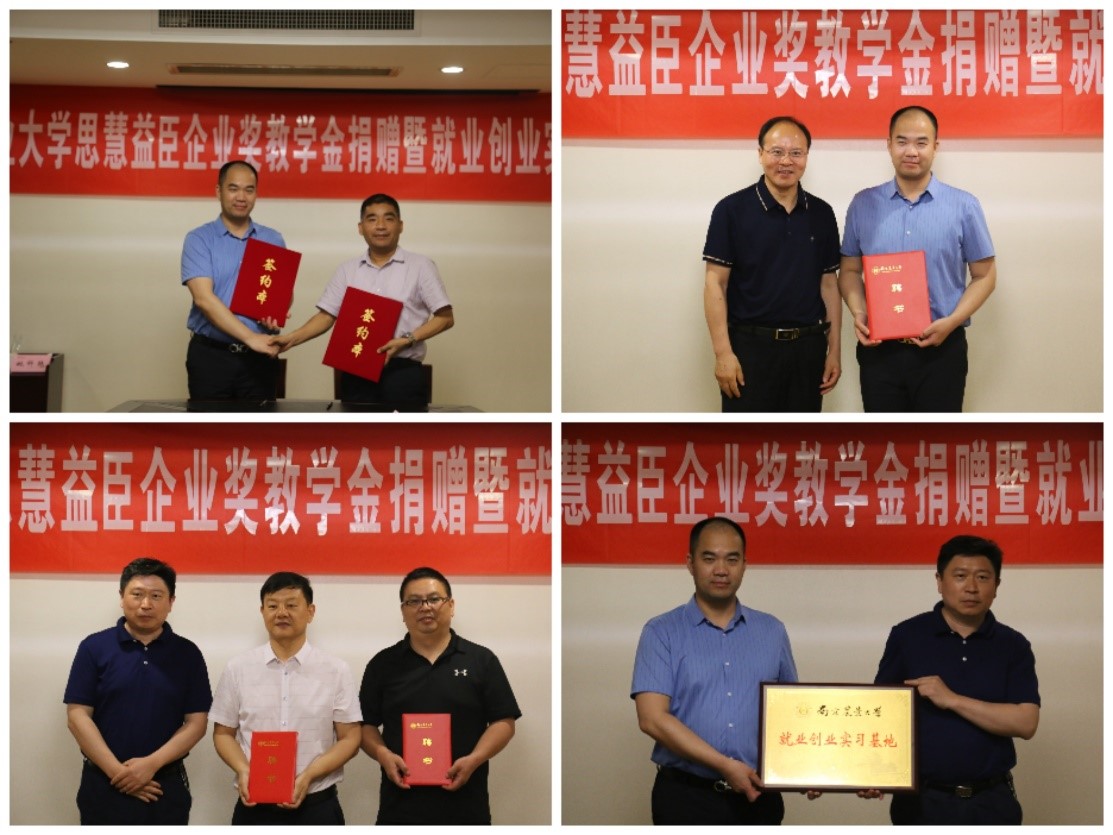 之后,校企双方举行签约和授牌仪式。狄传华与樊建元签署奖教学金设立协议,并为樊建元颁发捐赠证书。姚兆余向樊建元颁发学院兼职教授聘书。冯绪猛向杨国生、卜志华等颁发创新创业导师聘书并签署大学生就业创业实习基地协议,并举行授牌仪式。
