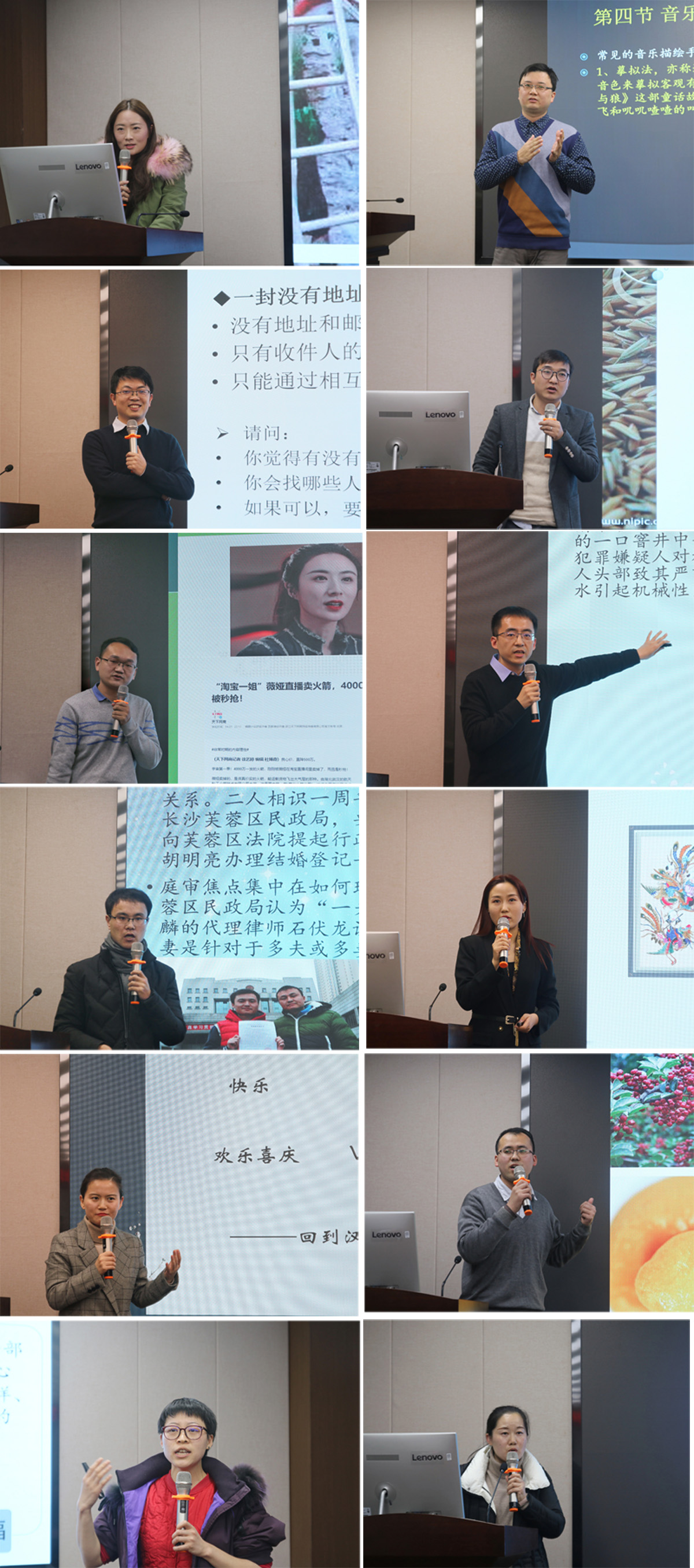 此次参赛选手总共12人,包括11位青年教师和黄颖老师教学团队,分别来自学院的7个系室。授课内容涉及专业认识实践——从文物毁容性修改看专业素养的培育、音乐鉴赏、社会学概论、世界农业文明史、旅游文化学、刑事诉讼法学、宪法学、民俗与当代社会、旅游策划学等。比赛过程中,各位参赛教师充分运用丰富的教学方法与教学手段,通过精美的课件展示、生动的语言表达、有趣的课堂互动,充分展现出他们对教学的探索和思考,彰显了各自的教学魅力与风格。