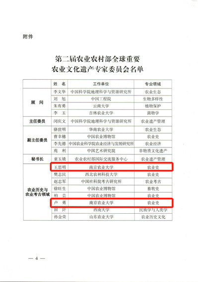中华农业文明研究院院长王思明教授、中华农业文明博物馆常务副馆长卢勇教授成功入选专家委员会名单。