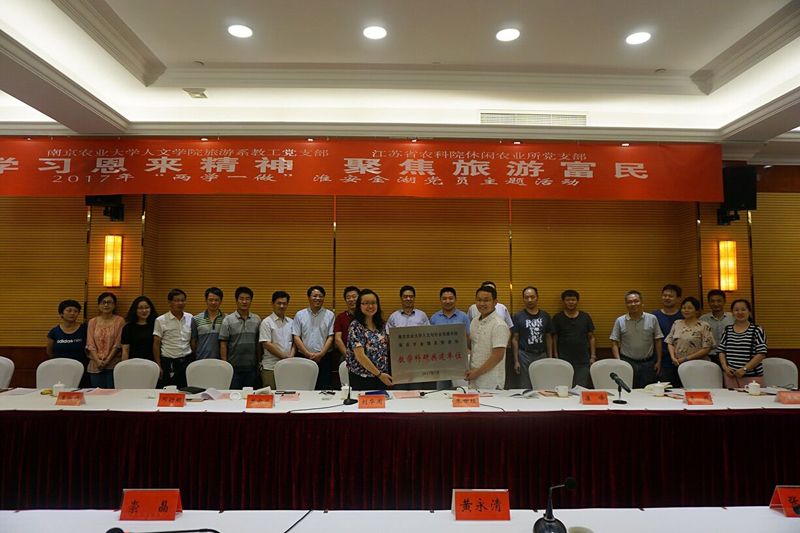 党委书记朱世桂向金湖县旅游局授牌,两单位结成“教学科研共建单位”,预示着今后双方将展开密切的合作;最后,两联合支部参会各方纷纷围绕“学习恩来精神、聚焦旅游富民”进行主题发言,与金湖休闲农业与乡村旅游的经营主体展开热烈的讨论,为其献计献策。