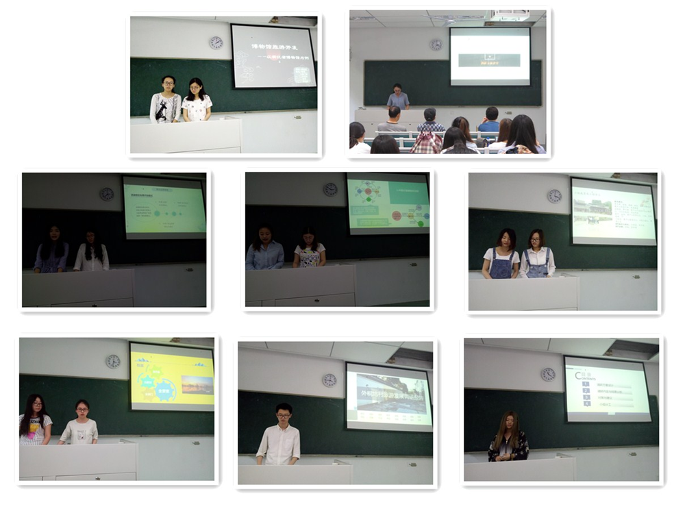 参加报告会的同学分成九组,每个小组派代表对该小组的调研报告进行了PPT展示和汇报,同时分享了实习期间的收获和感悟。调研报告共围绕九个主题展开,分别是博物馆旅游开发(以浙江省博物馆为例)、乡村旅游规划与开发(以南京高淳国际慢城为例)、民宿旅游开发与经营管理(以浙江德清莫干山九墅为例)、城市游憩商业区(RBD)休闲与旅游开发(以杭州市为例)、乡村创意旅游项目及产品开发(以常州溧阳天淼山庄为例)、休闲农庄经营管理(以常州溧阳天淼山庄为例)、传统村落遗产保护与旅游活化(以杭州外桐坞村为例)、城市公园游憩资源开发(以杭州西湖为例)、全域旅游发展(以杭州市为例)。