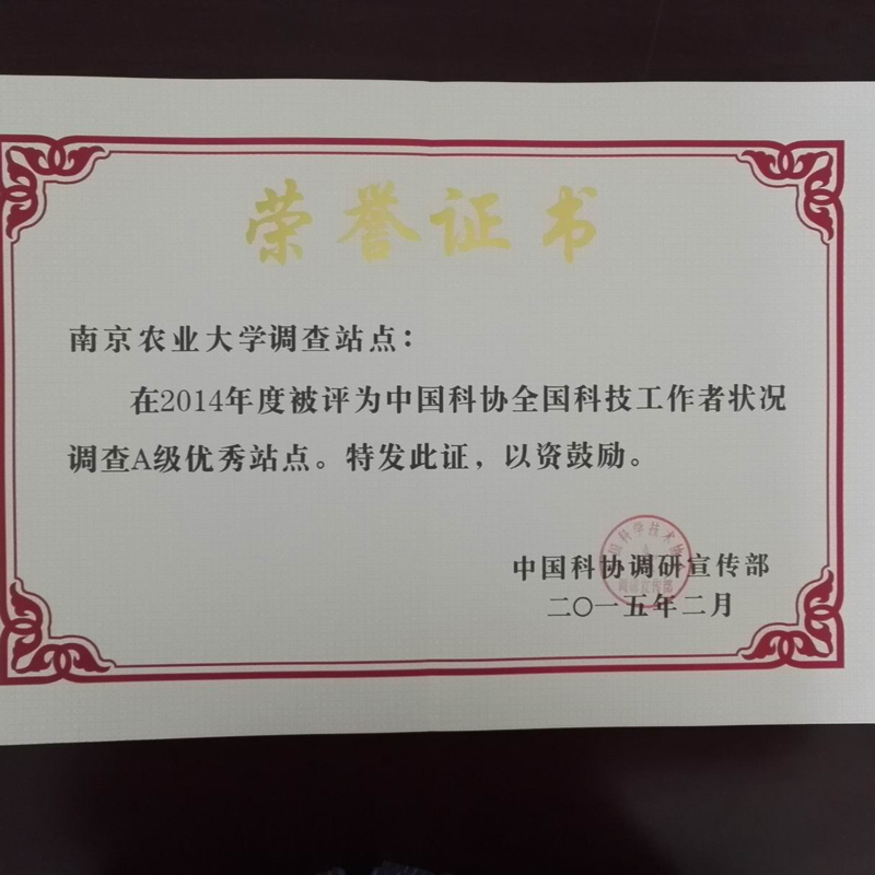调查站点工作认真、负责,连续两年被中国科协要求在全国站点大会上作经验交流,受到中国科协和江苏省科协领导表彰和参会代表的一致赞赏。