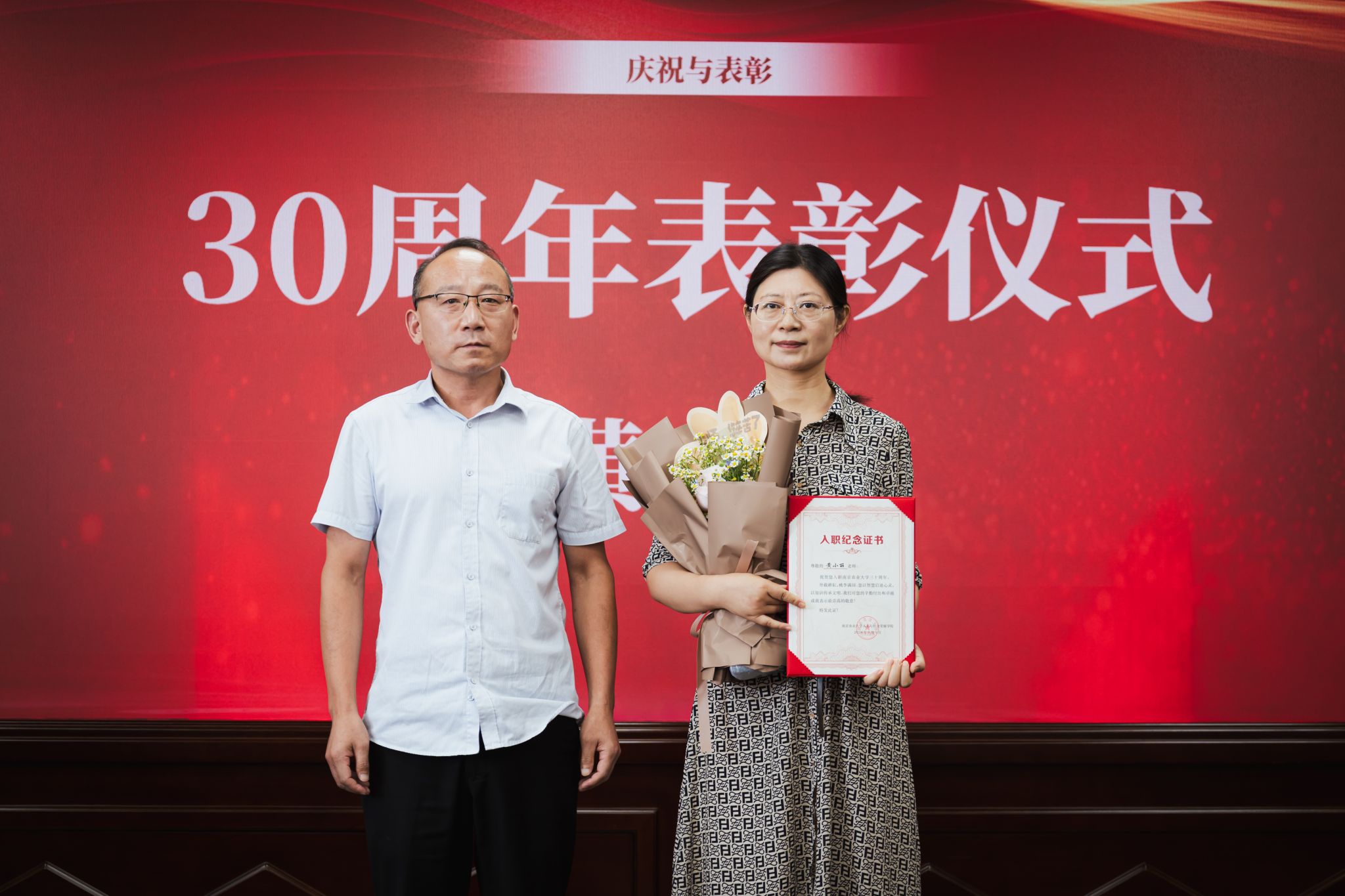 在入职周年表彰仪式中,学院领导李日葵书记、桑运川副书记、朱利群副院长和戚晓明副院长,分别为入职满40、30、20、10周年的教职员工颁发了证书和鲜花,以表彰他们多年来为学院发展所做出的卓越贡献。