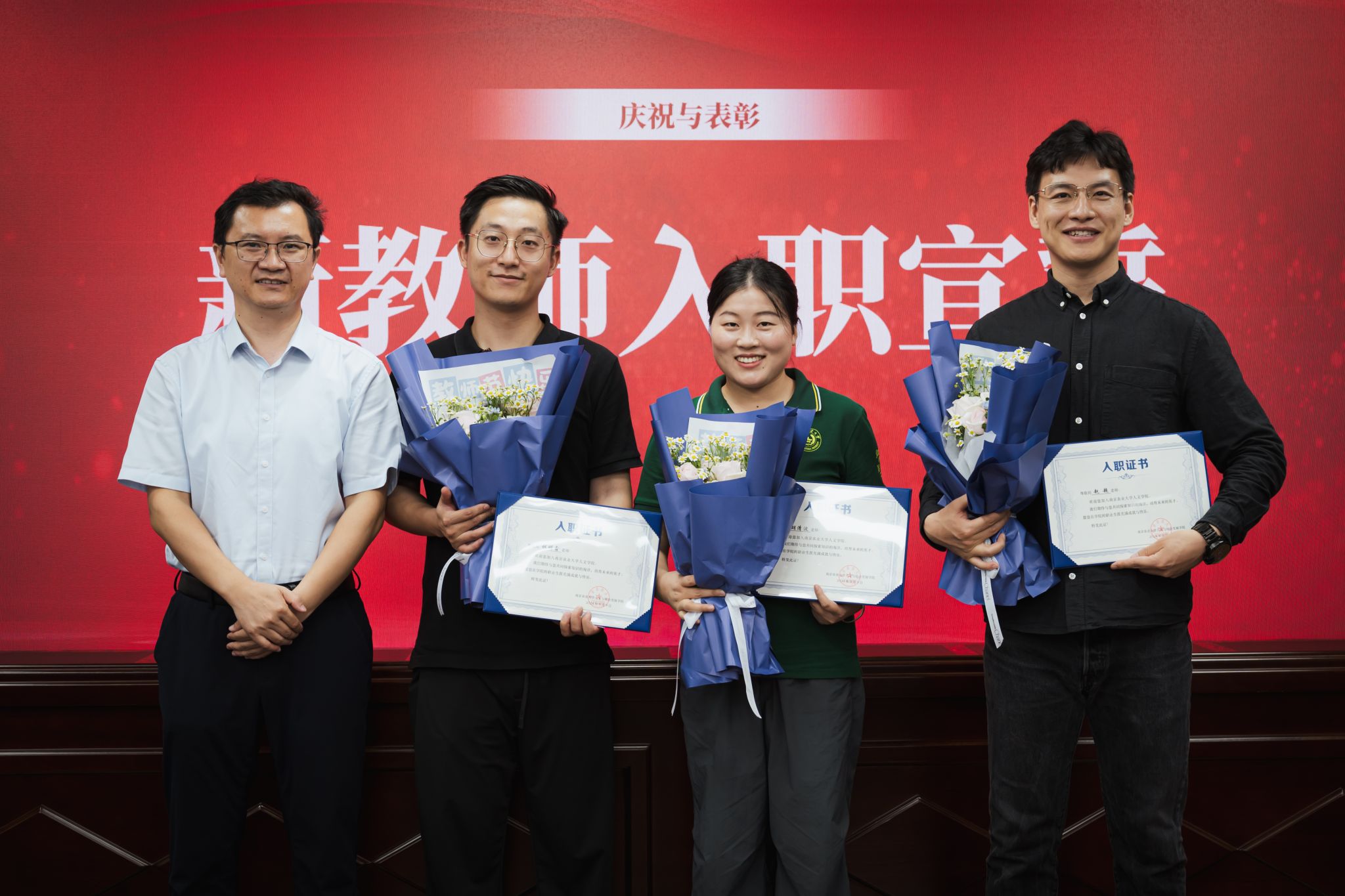 大会随后举行了庄严而温馨的新教师入职仪式。三位新加入的教师介绍了各自的教育经历和教学理念。在老教师的引导下,新教师们进行了庄严的职业宣誓,并从院领导手中接过了入职证书和鲜花。