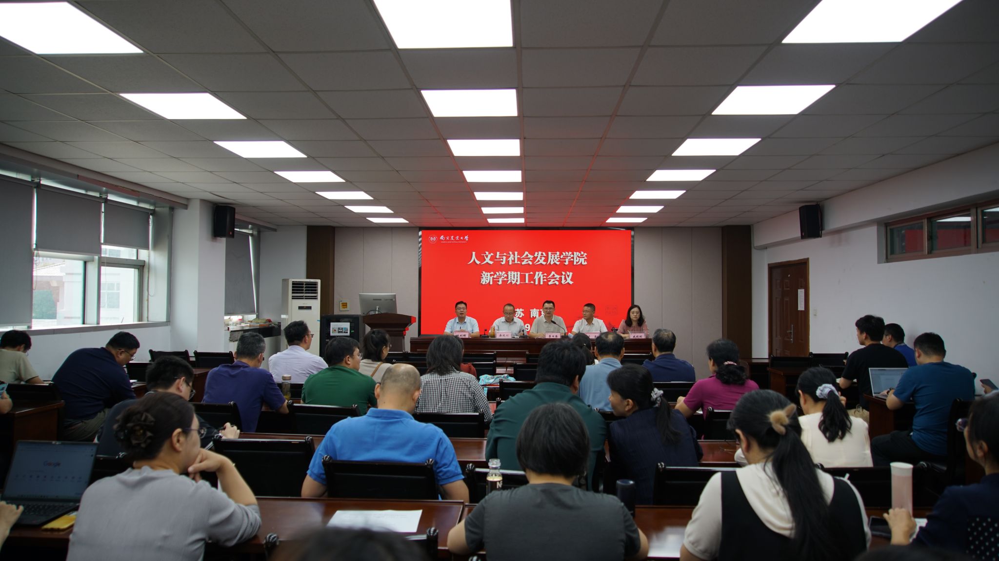 院党委副书记桑运川对新学期学生工作的思想政治教育、学风建设、学生就业、学生干部培养、纪律管理等五个方面工作进行部署。副院长朱利群在学科建设和研究生教育方面,对上半年的工作进行了总结,对新学期的研究生推免、导师资格审查、研究生实践、研究生入学考试自命题纪律要求、学院学科专业发展规划等方面进行了安排。副院长戚晓明肯定了学院教师近期获得6项国家社科基金和2项省社科基金的科研成绩,并指出在未来的科研工作中,学院将提升科研支撑平台建设,促进科研交叉融合和学习交流,继续发挥青年教师联合会的作用,推进学院科研工作走深走实。