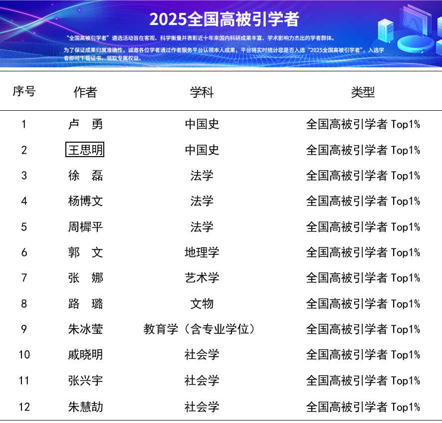 此次上榜学者阵容强大、学科分布广泛,涵盖中国史、法学、社会学、地理学、艺术学、文物、教育学等多个核心学科领域,具体名单如下: