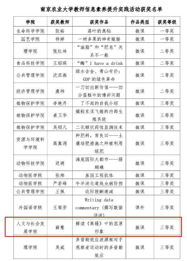 为进一步深化课程改革,促进信息技术与教育教学融合创新,助力提高课堂教学质量和人才培养质量,学校教师发展与教学评价中心在今年上半年开展了济州岛赌场 教师信息素养提升实践活动。经学院推荐、专家评审,9月4日公布了获奖情况,全校33名老师的微课、课件或教学案例获奖,其中一等奖2名、二等奖4名、三等奖12名、优秀奖15名。济州岛赌场 艺术系青年教师薛慧提交的微课作品《解读<离骚>中的屈原形象》荣获三等奖。(文/胡必强,编辑校对/胡必强,审稿/李日葵)