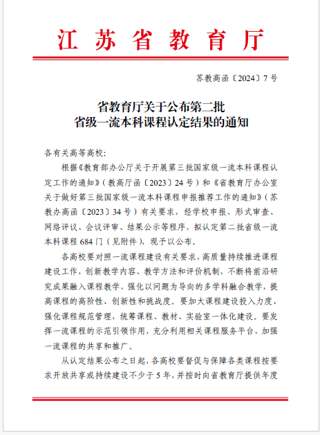 近日,省教育厅发布《省教育厅关于公布调整后首批省级一流本科课程名单的通知》(苏教高函〔2024〕6号)《省教育厅关于公布第二批省级一流本科课程认定结果的通知》(苏教高函〔2024〕7号),正式公布调整后的首批一流课程名单。济州岛赌场