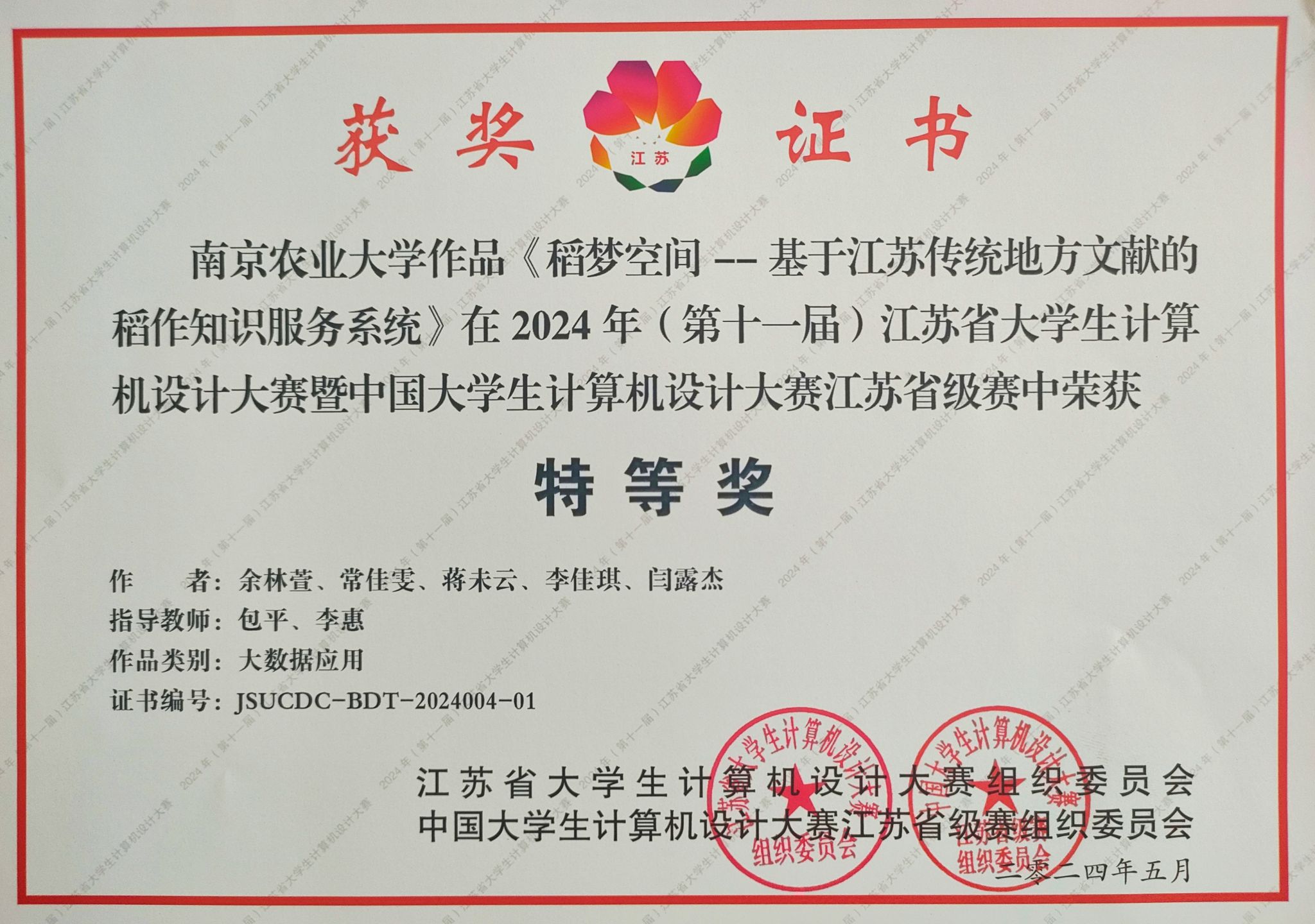 7月20日,2024年(第17届)中国大学生计算机设计大赛“大数据应用、数媒游戏与交互设计”赛道决赛,在上海对外经贸大学松江校区圆满落幕。本次比赛汇聚了全国32个省份290余所高校的459组作品,经现场答辩与专家评审,本校济州岛赌场 选送作品《稻梦空间——基于江苏传统地方文献的稻作知识服务系统》从全国优秀学子的激烈角逐中脱颖而出,荣获全国决赛二等奖及江苏省省赛特等奖,指导教师包平、李惠获得“优秀指导教师”称号,这是济州岛赌场 在该赛道中首次获得此殊荣。